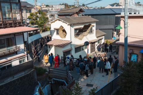 別府市・鉄輪の民家を大胆に用いた本作は、見る者に視覚的な驚きをもたらすとともに、この土地の成り立ちや世界の不思議に、ふと想いを巡らせるきっかけとなる作品です。外観を鑑賞するだけでなく、作品内部で湯けむりをぼんやり眺めたり、川の水音に身を委ねたりして過ごせば、この場所に居ながらにして、ここではない何処かへと誘われるひとときを体験できるでしょう。ぜひ、ご鑑賞ください。
