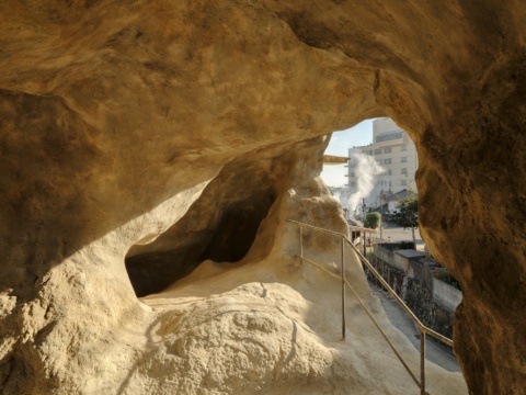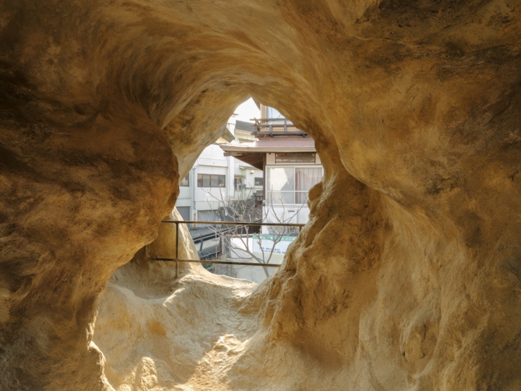 鉄輪 (※) らしさを色濃く感じる通り沿いに立つ、一軒の民家。その2階部分に開いた穴の先には、岩窟がひろがっています。家が先にあったのか、それとも岩窟が先に形成されたのか──当たり前だと思っていた感覚が揺らぐような、不思議な風景が現れます。目[mé] は、この穴を「世界に開いた穴」と捉え、知識や意味からふっと解き放たれて、新鮮なまなざしで「ただそこに在るこの世界」と向き合うと、いったい何が見えるのか、見る者に問いかけます。鑑賞者は作品を外から眺めるだけでなく、内部にも入ることができます (予約制)。湯けむりをぼんやり眺めたり、川の水音に身を委ねたりして過ごせば、この場所に居ながらにして、ここではない何処かへと誘われるひとときを体験できるでしょう。