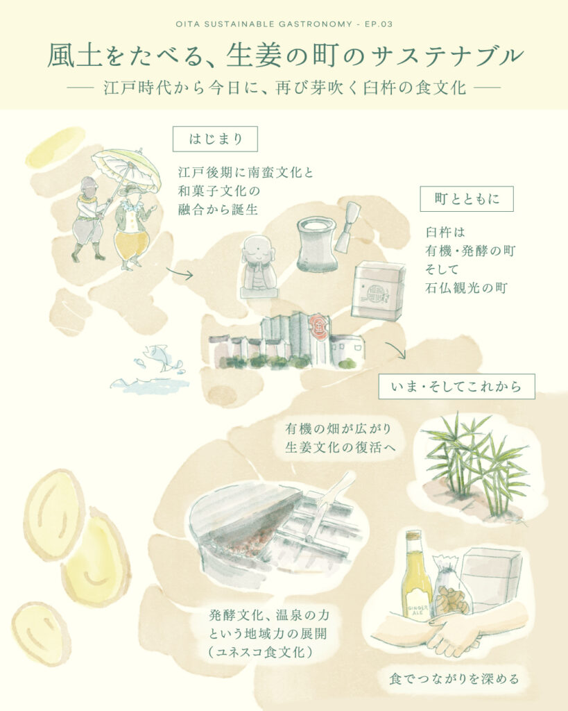 臼杵の風土と生姜が、人と人の輪を結び、暮らしの中に息づいていく。サステナブルとは、難しい概念ではなく、こうした日々の往復の中で生まれる、小さな循環の積み重ねなのだと感じます。